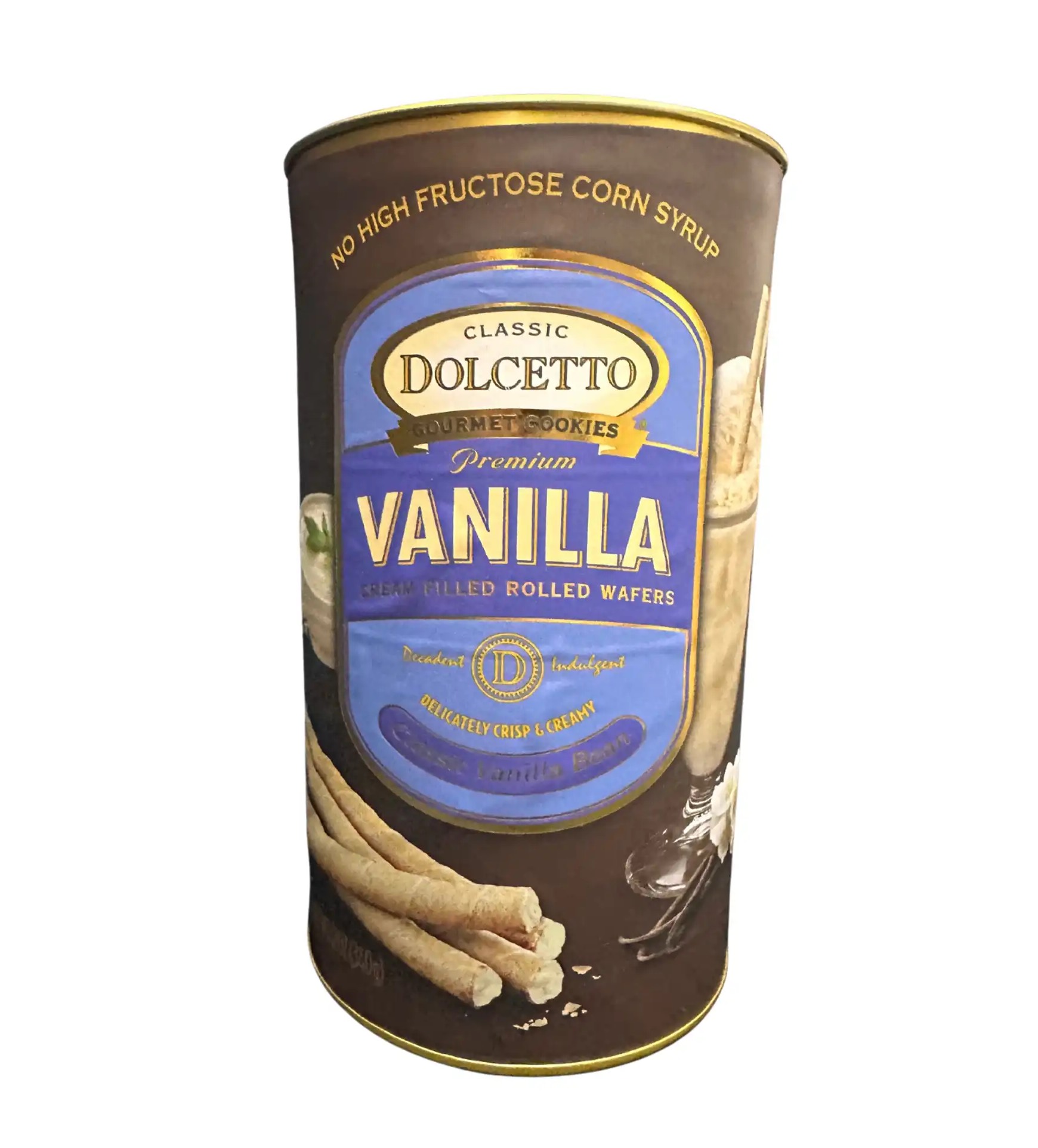 Classic Dolcetto – Premium Vanilla Cream Filled Rolled Wafers Delight in the crispy, delicate crunch of Classic Dolcetto Premium Vanilla Cream Filled Rolled Wafers. Each wafer is expertly baked to a light, golden perfection and filled with smooth, rich vanilla cream for a luxurious and satisfying treat. Perfect for pairing with coffee, tea, or enjoying on its own, these wafers bring a touch of indulgence to any moment.