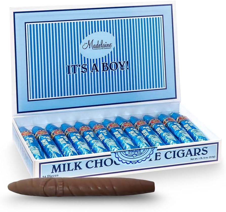 Milk chocolate cigars from Madelaine, typically featuring a smooth and creamy milk chocolate coating, often given to celebrate the birth of a baby boy.