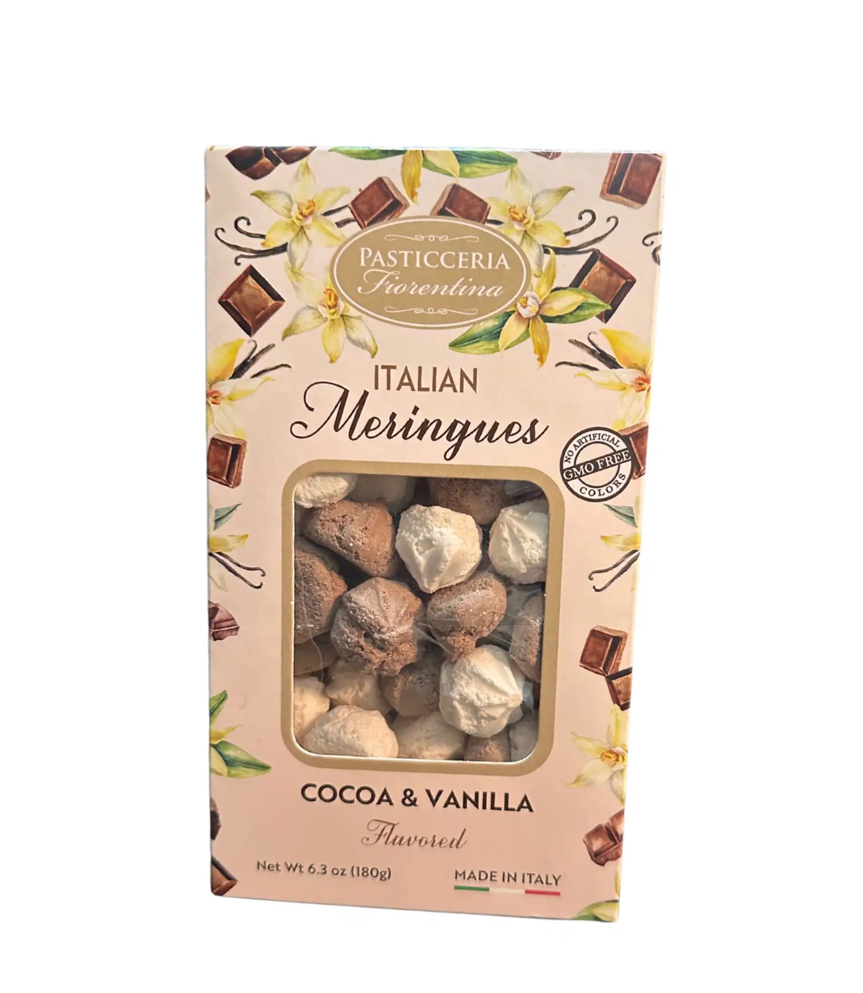 Pasticceria Fiorentina – Italian Meringues Cocoa & Vanilla Delight in the light, crispy perfection of Pasticceria Fiorentina Italian Meringues in a rich Cocoa & Vanilla flavor. These artisanal Italian meringues are crafted with the finest ingredients, blending the deep essence of cocoa with the smooth sweetness of vanilla for a perfectly balanced bite. Enjoy them as a refined dessert, an elegant pairing with coffee or tea, or a sweet indulgence any time of day!