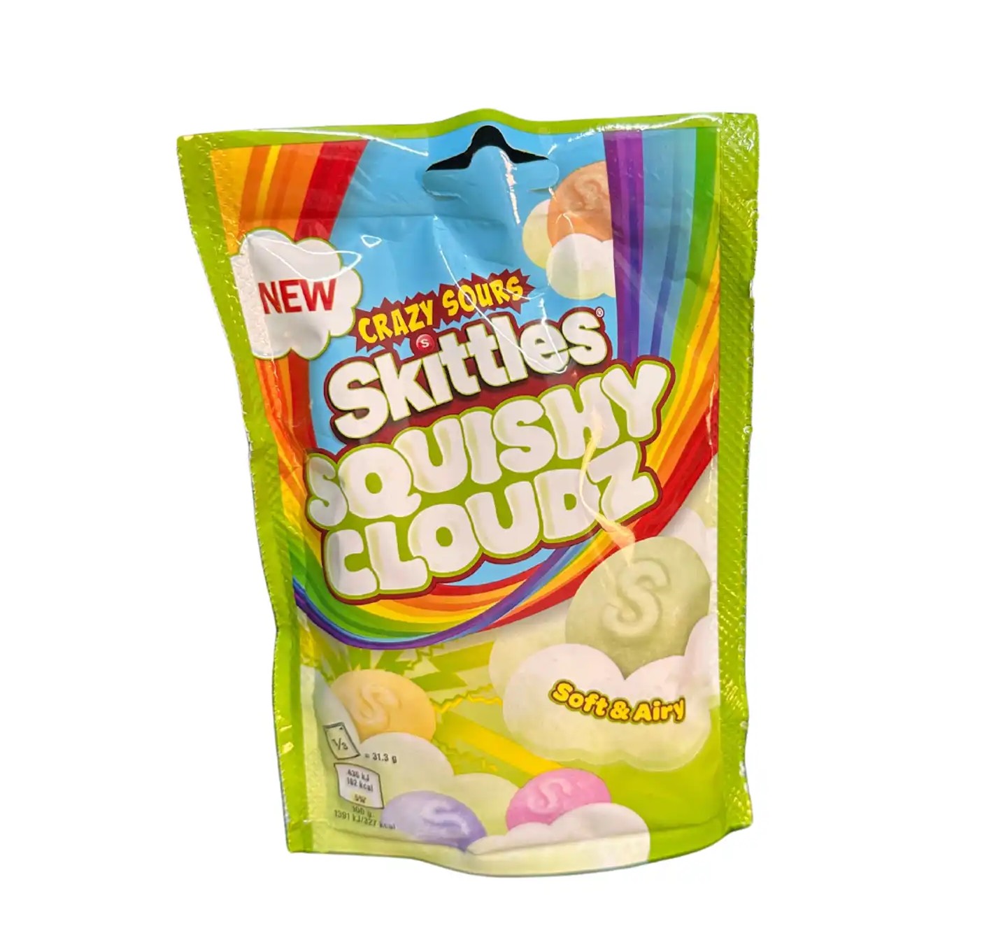 Skittles Squishy Cloudz Crazy Sour Experience a new level of sour excitement with Skittles Squishy Cloudz Crazy Sour! These soft, pillowy gummies pack an intense sour punch while still delivering the classic fruity flavors you love. Each bite is a tangy, mouthwatering explosion that melts in your mouth with a fluffy, squishy texture. Perfect for those who crave a sour kick with a soft and chewy twist!