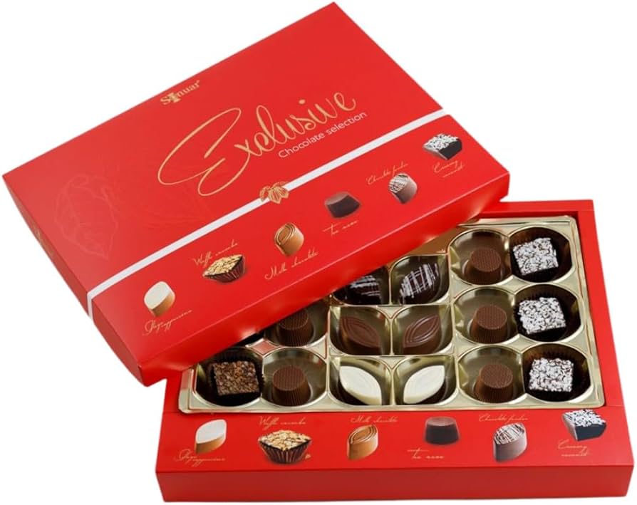A curated selection of assorted hand-crafted chocolates, featuring diverse flavors and textures, typically including rich ganaches, smooth caramels, and nutty pralines.