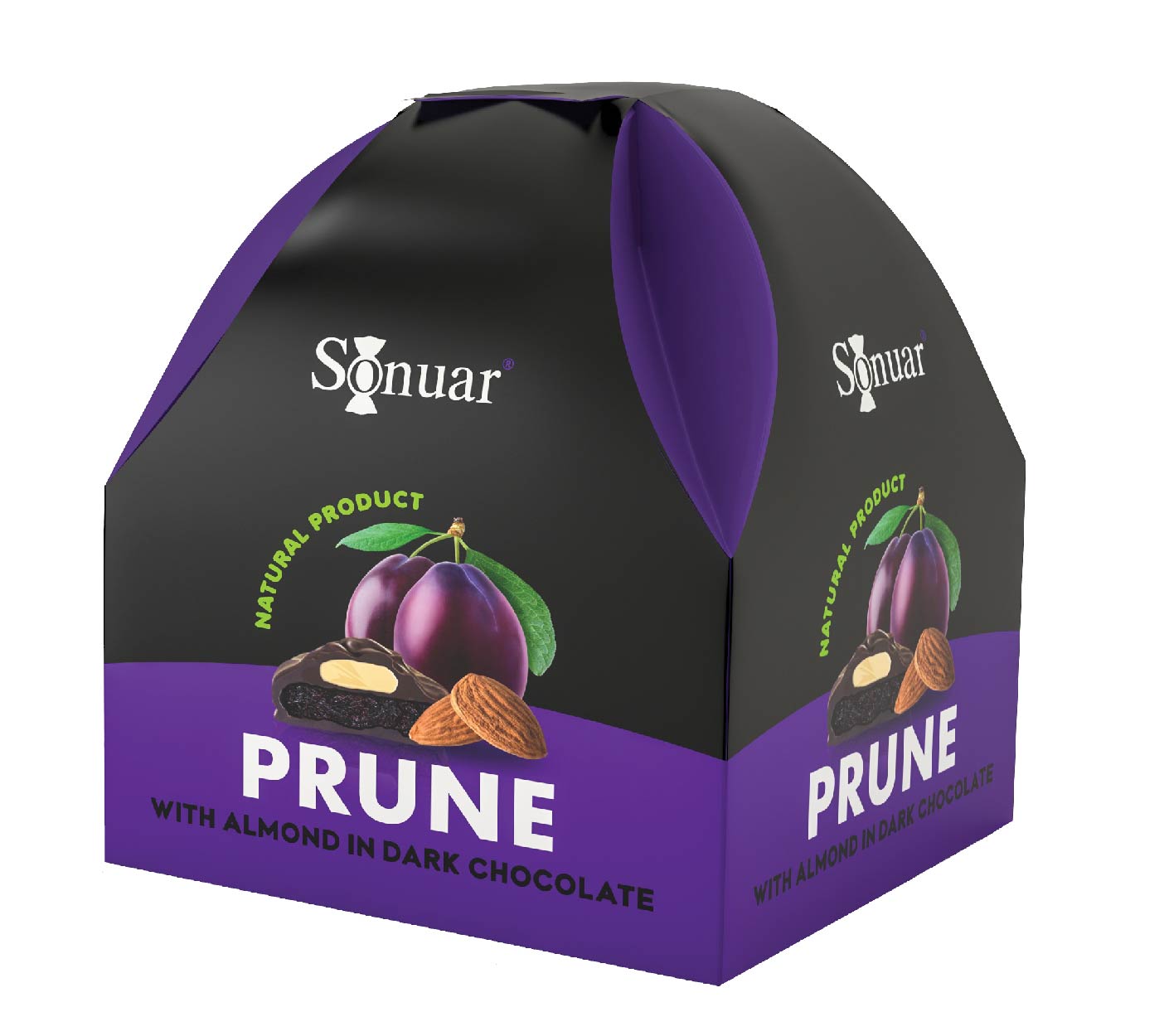 Prunes and almonds enrobed in rich dark chocolate.